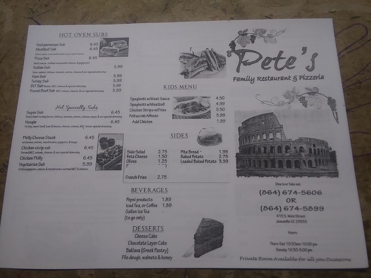 Welcome to Pete's Family Restaurant, nestled in the heart of Jonesville, SC. This charming eatery prides itself on delicious, wholesome meals that promise to satisfy every palate. From the moment you step inside, you are welcomed by friendly staff and a cozy atmosphere, ideal for both lunch and dinner.